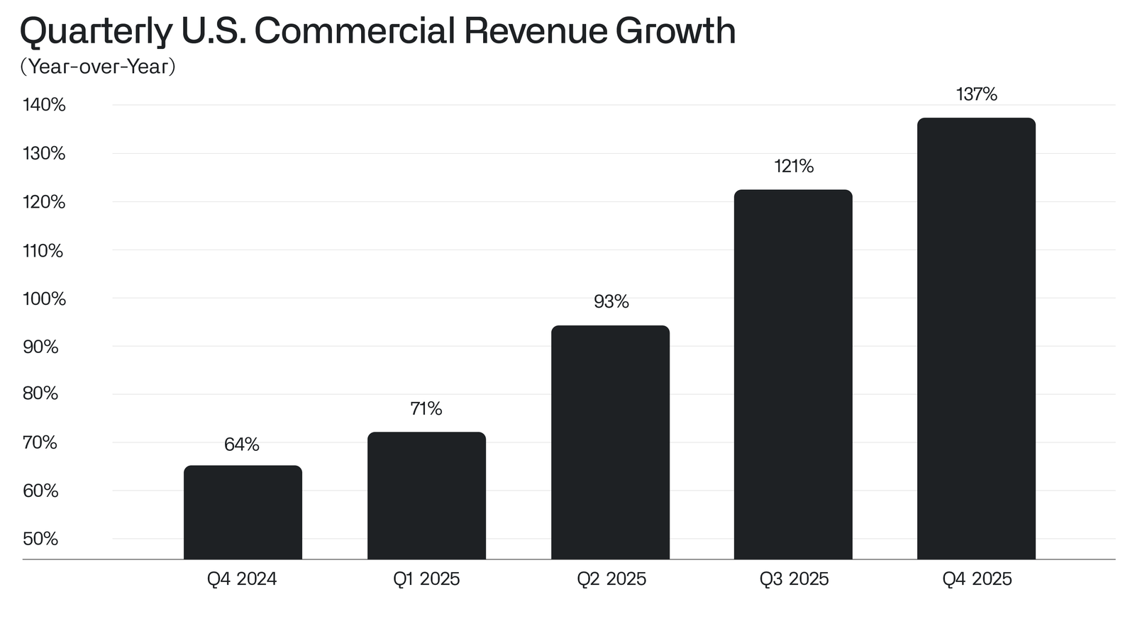 숫자부터 보자. 2025년 4분기 매출 14억 달러, 전년 동기 대비 70% 성장. 순이익 6억 900만 달러, 전분기 대비 28% 증가. 이것만으로도 놀랍지만 진짜 눈이 가는 건 미국 시장이다. 미국 매출만 11억 달러로 전년 대비 93% 성장했고, 그중 민간 기업용 비즈니스는 5억 700만 달러 - 전년 대비 137% 폭등이다. 1년 만에 두 배 이상 커진 것이다.